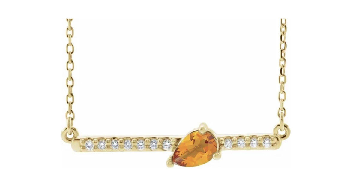 When we think of fall, we think of earthy tones. Jewelry that incorporates these shades can enhance your fall outfits. Look for pieces featuring gemstones like citrine, amber, and smoky quartz. This necklace from Skydell Design is perfect. It features a natural green tourmaline stone with a gold chain. Another beautiful color to wear this fall is citrine. The orange huge pairs beautifully with gold and gives pumpkin spice vibes. This citrine diamond bar necklace is the perfect fall staple. These colors will have you ready for fall.