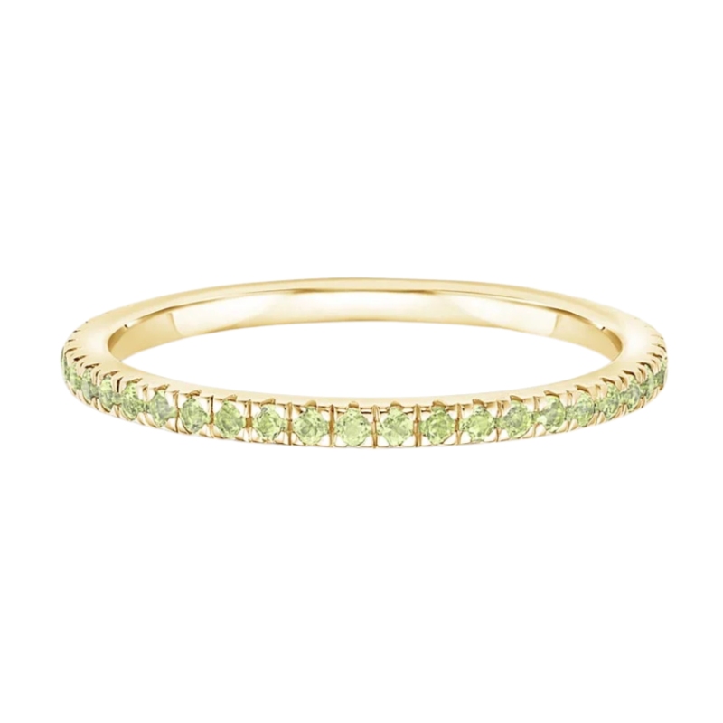 This petite ring features scalloped pavé peridot in elegantly sculpted prongs that extend three-fourths of the way around the band, leaving a small sizing bar in back.