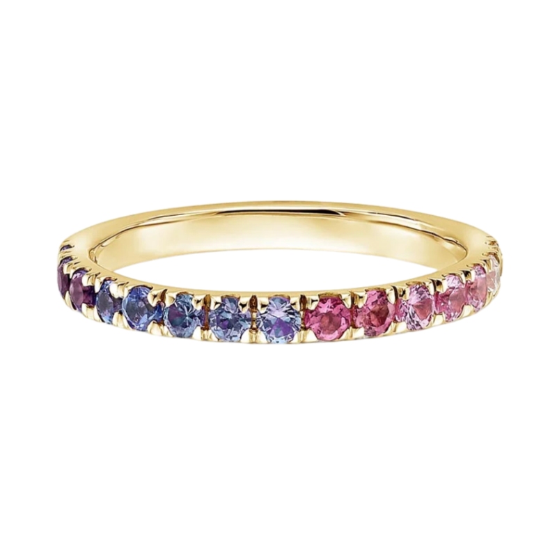 This chic and whimsical ring features a striking ombre effect, with shimmering diamonds, sapphires, tourmalines, lab-grown alexandrites, tanzanites, and amethysts that wrap halfway around the band.