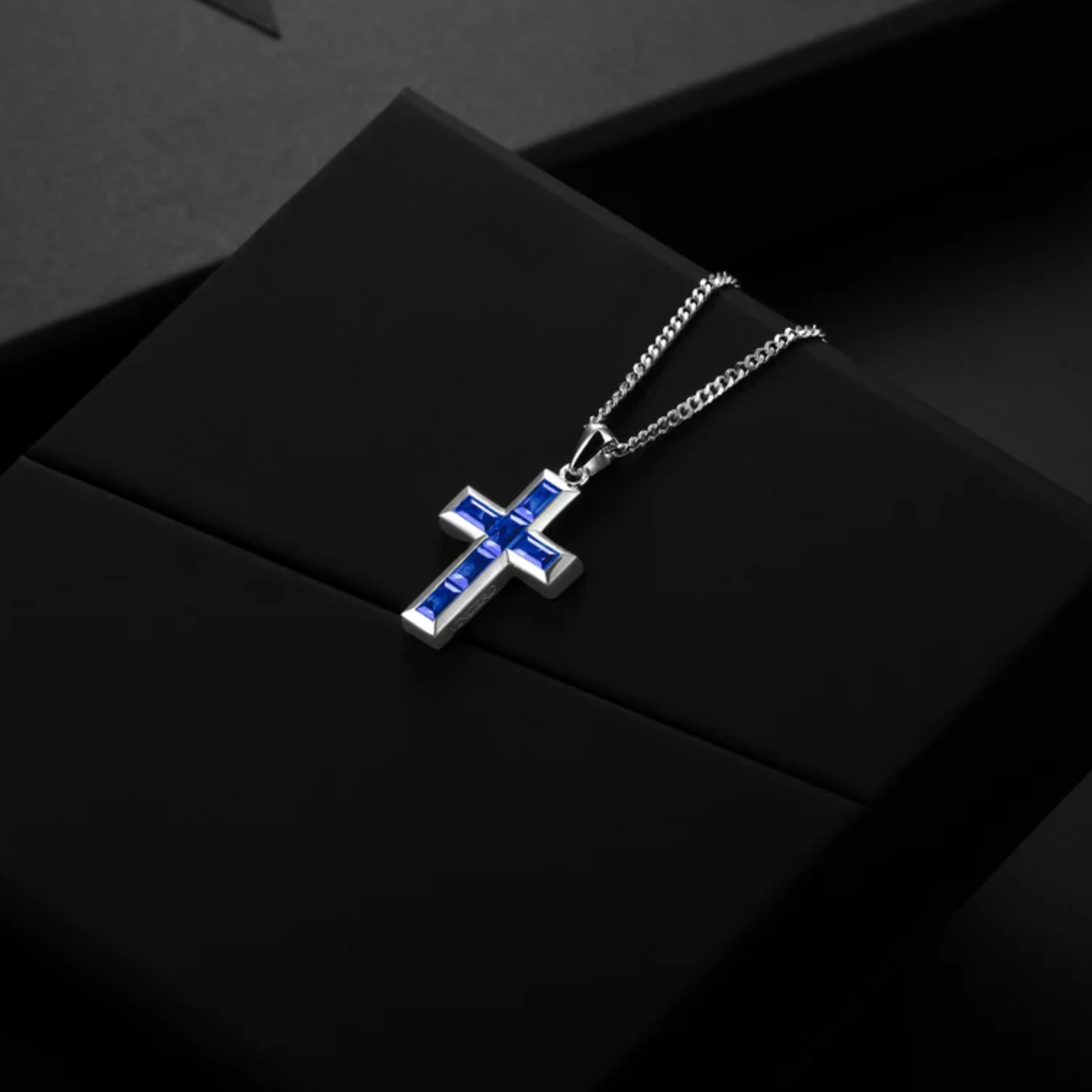 Sapphire Blue Gemstones Set in a Sterling Silver Cross Pendant Necklace