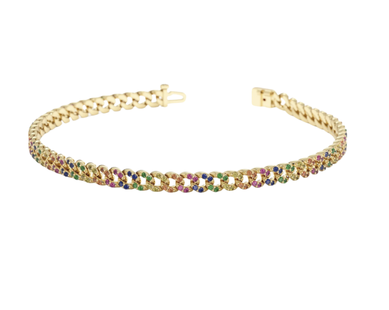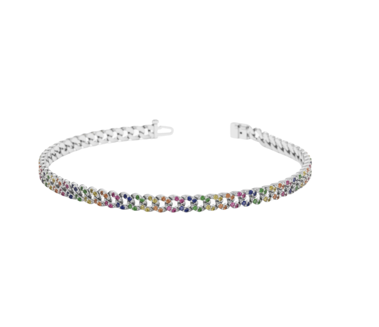 This bold bracelet features a dazzling array of genuine rainbow sapphires, each showcasing a unique blend of fiery reds, sunny yellows, calming blues, and refreshing greens.