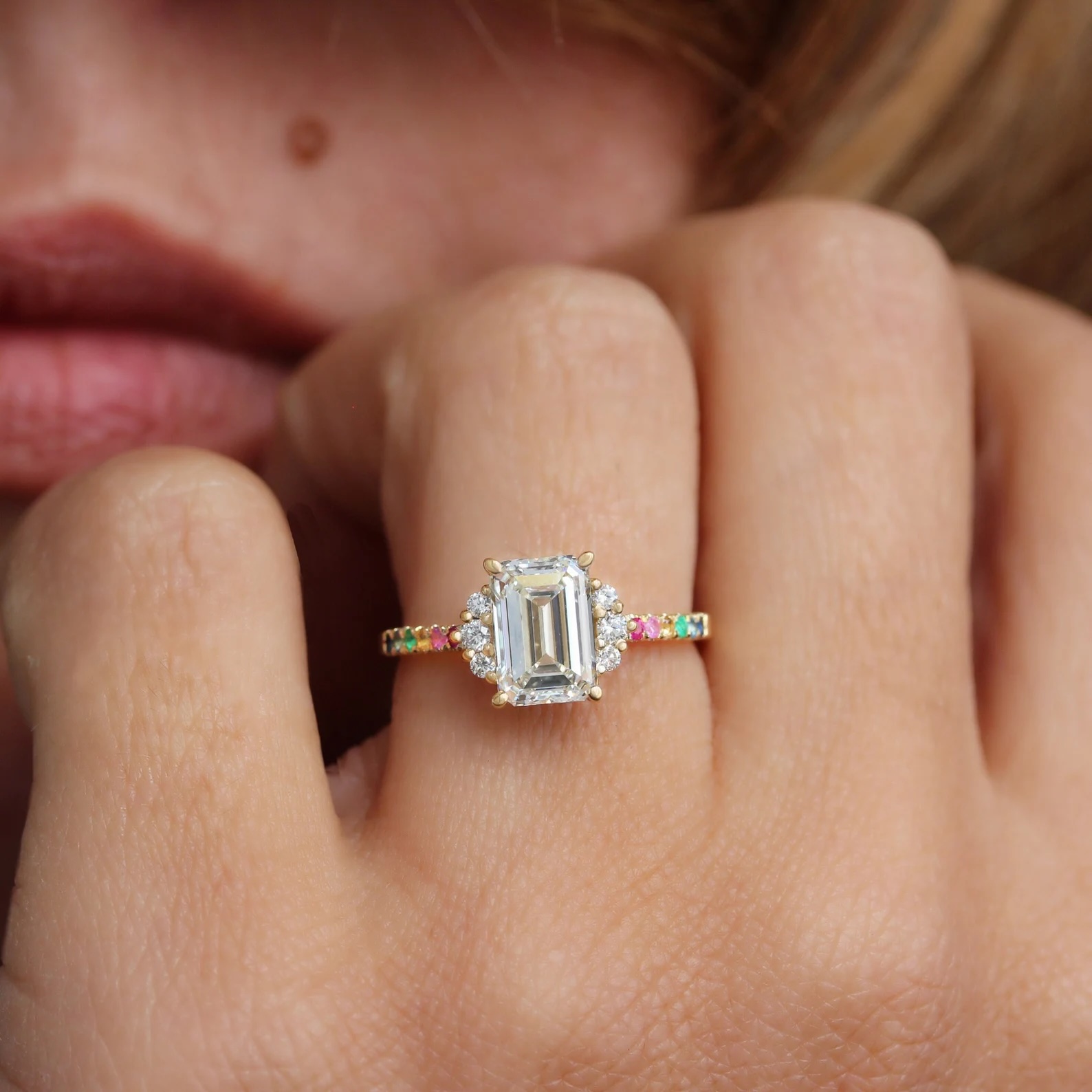 Make your proposal unforgettable with this 2ct Emerald Cut Lab Diamond Engagement Ring featuring a stunning rainbow gemstone band. The emerald-cut lab-grown diamond exudes timeless elegance and brilliance, while the vibrant rainbow gemstones along the band symbolize love, diversity, and uniqueness.
