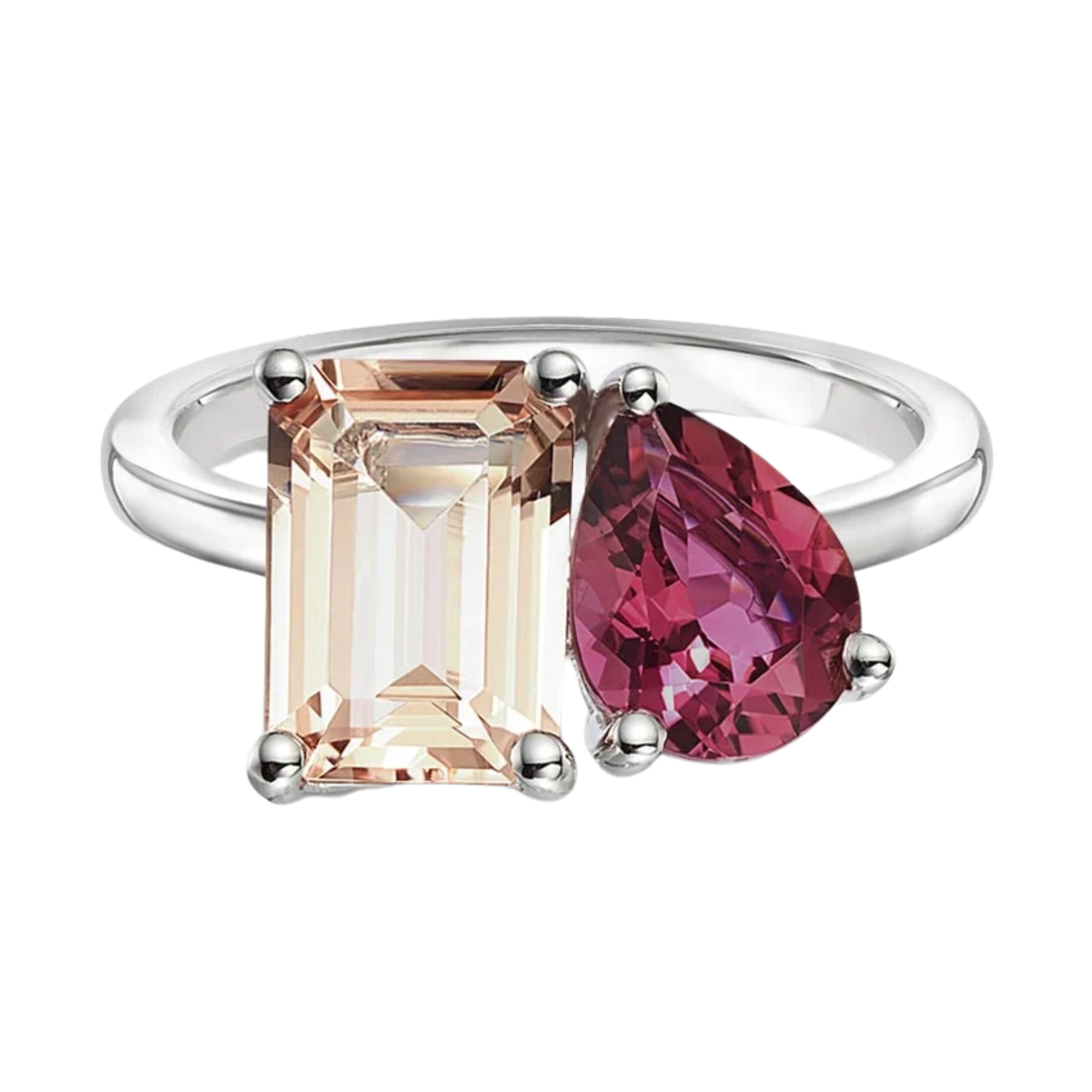 Radiating in soft pink and peach tones, this rare toi et moi ring is perfectly on trend, featuring a morganite and a pink tourmaline in a beautifully matched pair.