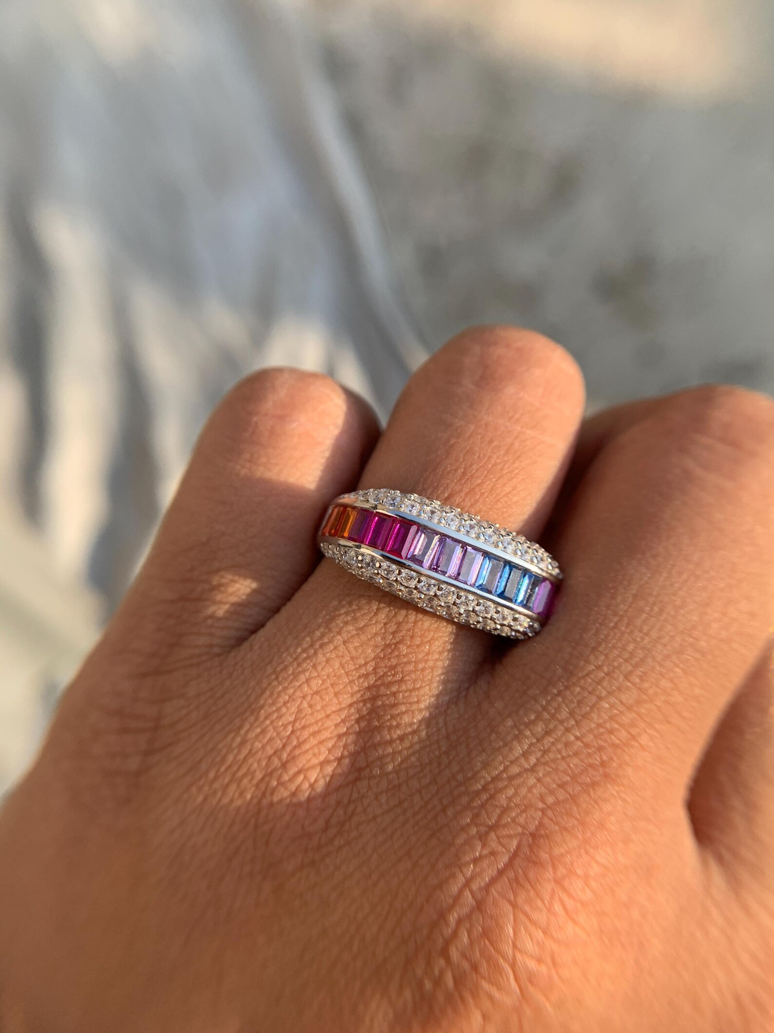 This Multi Gemstone Ring is a stunning statement piece, featuring an exquisite mix of baguette and round diamonds alongside a radiant array of gemstones.