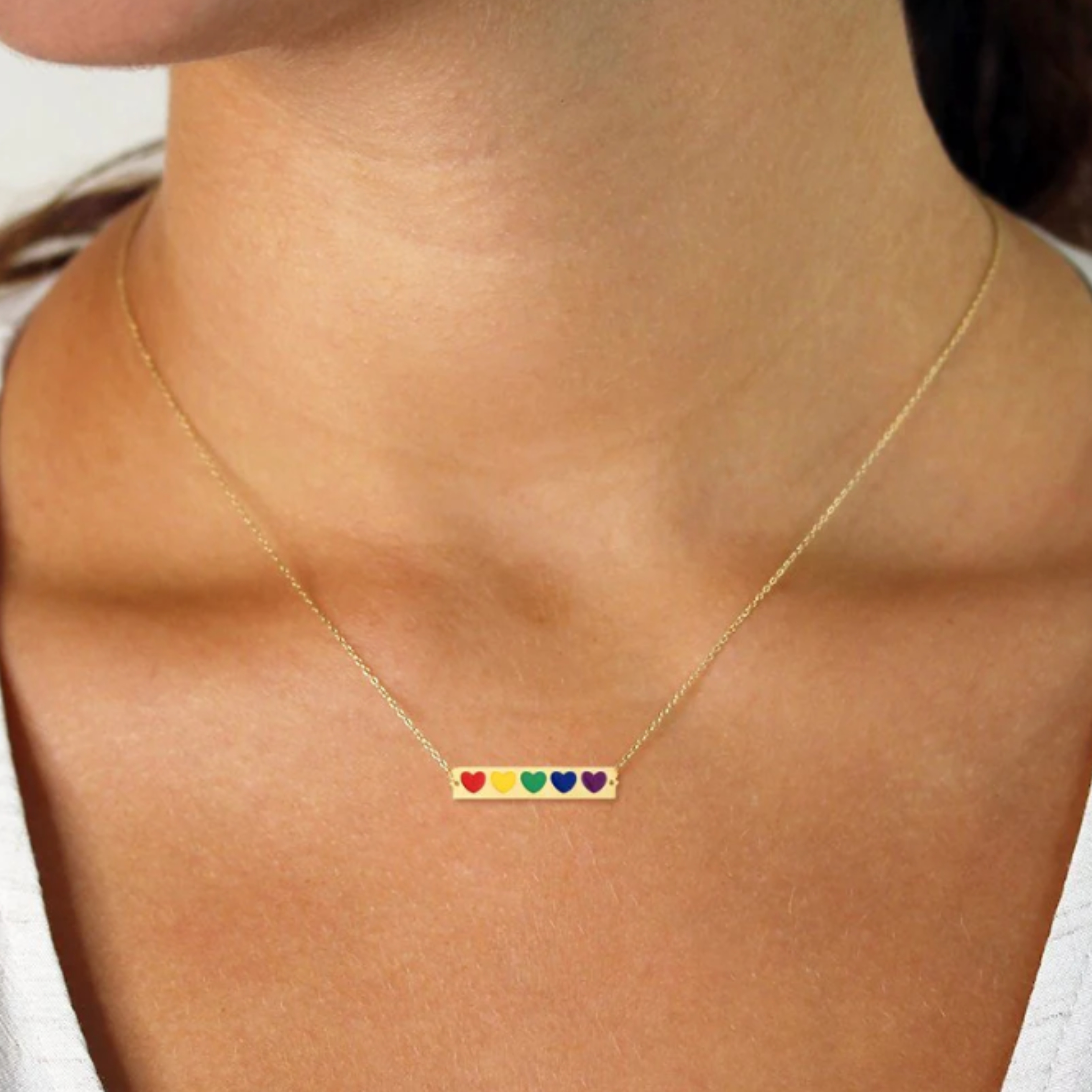 Rainbow Enamel Hearts Bar Paperclip Necklace 14K Yellow Gold