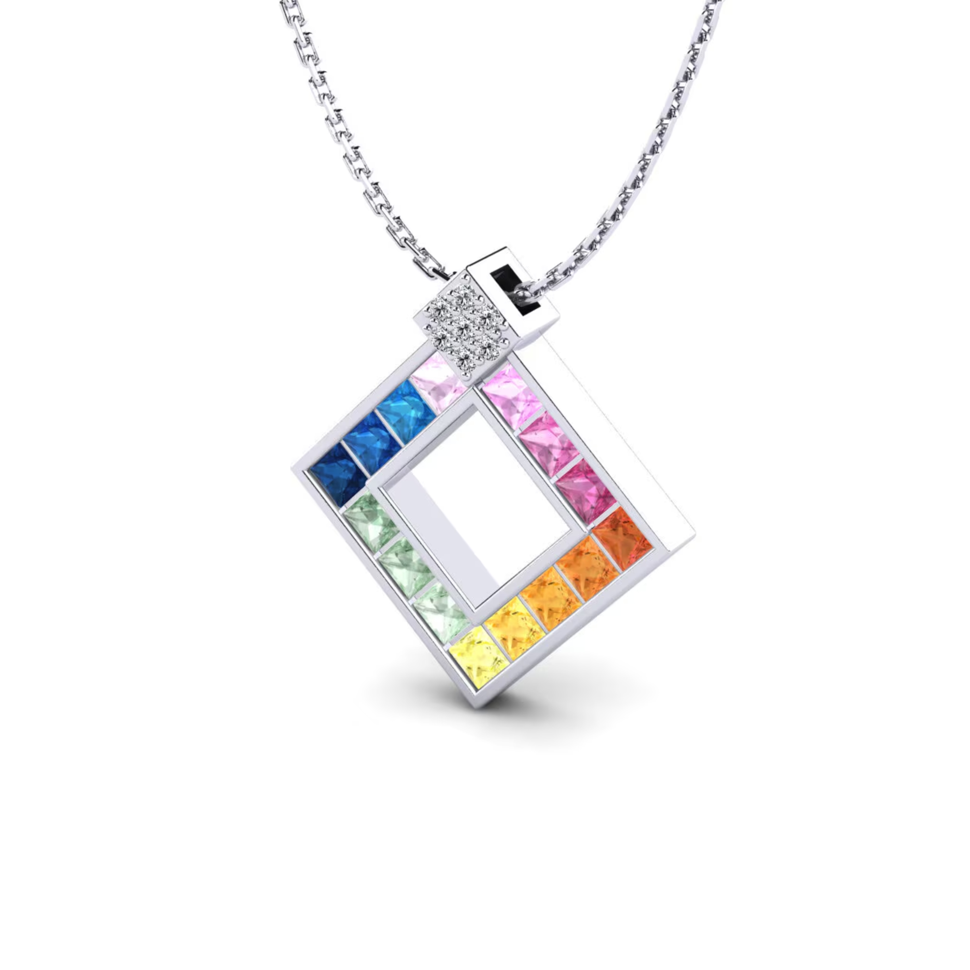 Square Shaped Pendant, Princess Cut Sapphire Multi-Color Necklace, CZ accents