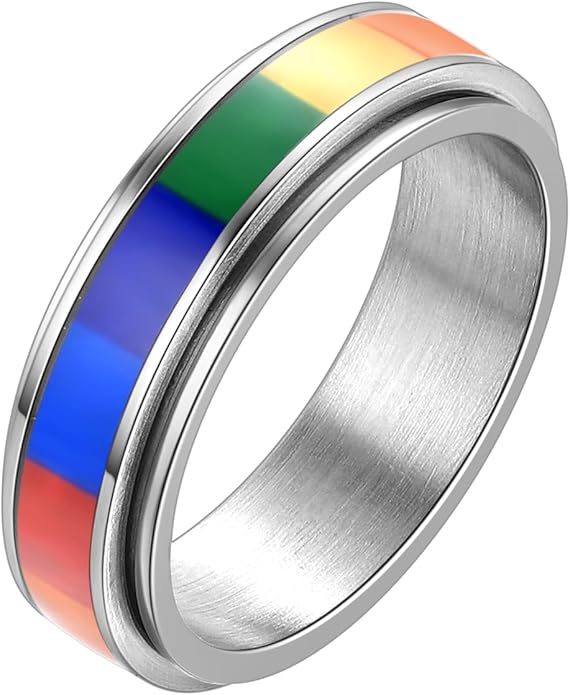 his celebrates your love .Gay couples wedding band has rainbow stripe continuously around the band .