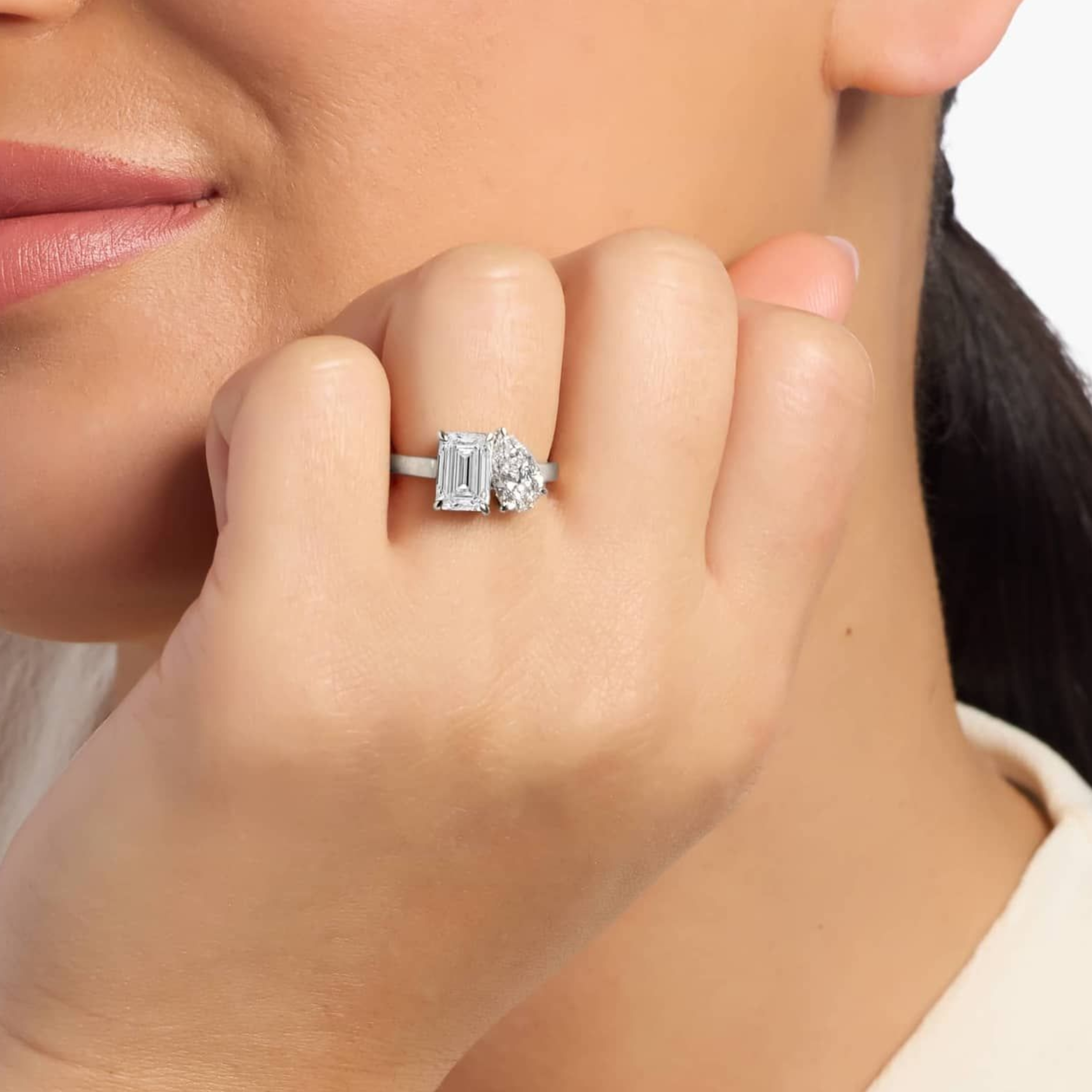 Celebrate your love with a modern twist on timeless romance. This Toi et Moi two-stone ring features a captivating 3.00 carat total weight combination of lab-grown diamonds: a bold emerald cut paired with an elegant pear-shaped stone, symbolizing two souls side by side. Set in luminous 14K white gold, this ring offers maximum brilliance, clean lines, and a contemporary yet classic silhouette. E Color, VS2 Clarity