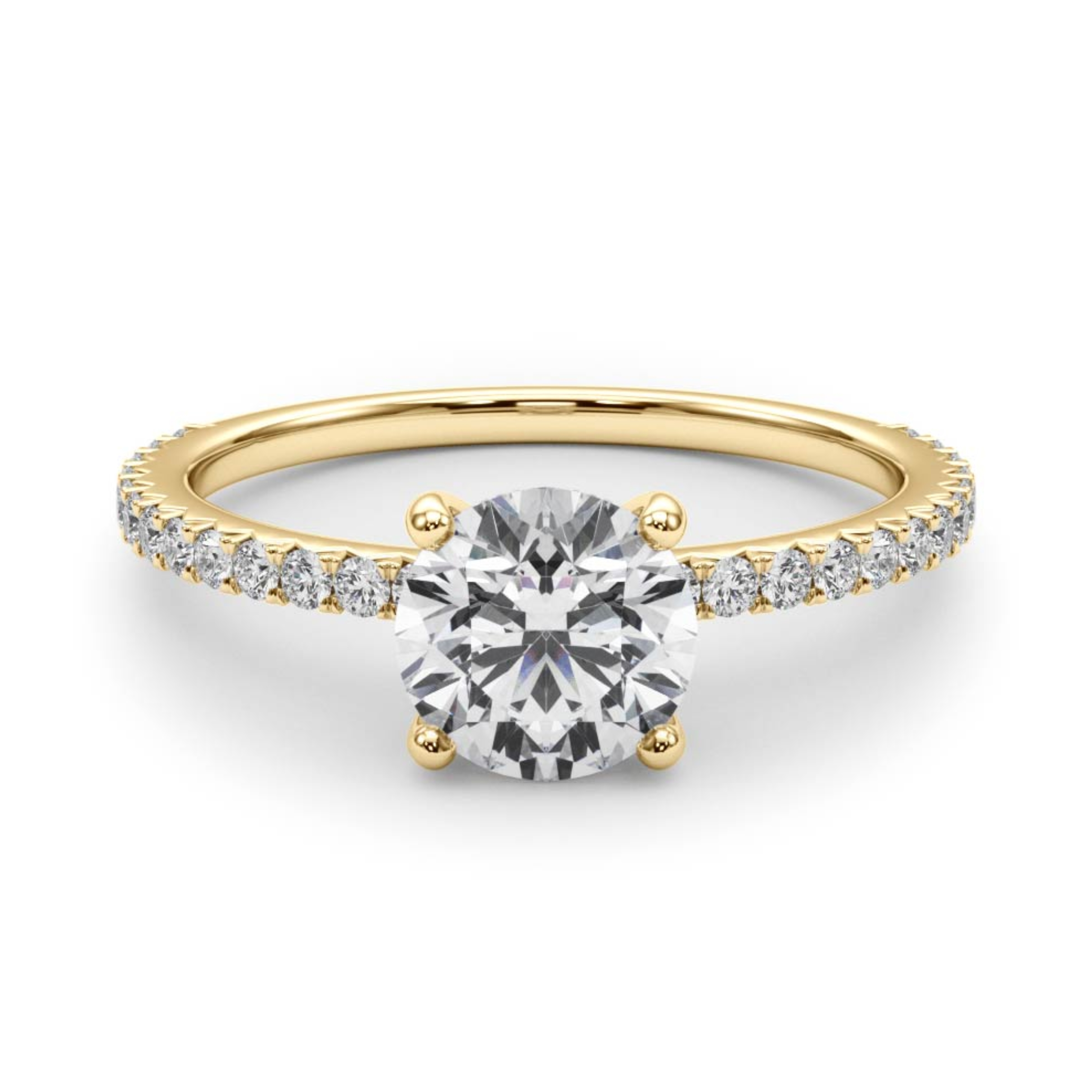 This lab-grown round cut diamond weighs 2.89 carats. With its classic shape and precise faceting, this diamond displays a captivating sparkle that catches the eye. Set in a 14K white gold or yellow gold diamond setting, the center diamond is accompanied by additional round cut diamonds weighing a total of 1.25 carats. The diamond setting surrounds and enhances the center stone, adding a stunning display of brilliance and elegance. This exquisite piece is a perfect choice for those seeking a sustainable and dazzling symbol of timeless beauty and luxury with an extra touch of sparkle. E Color, VS1 Clarity